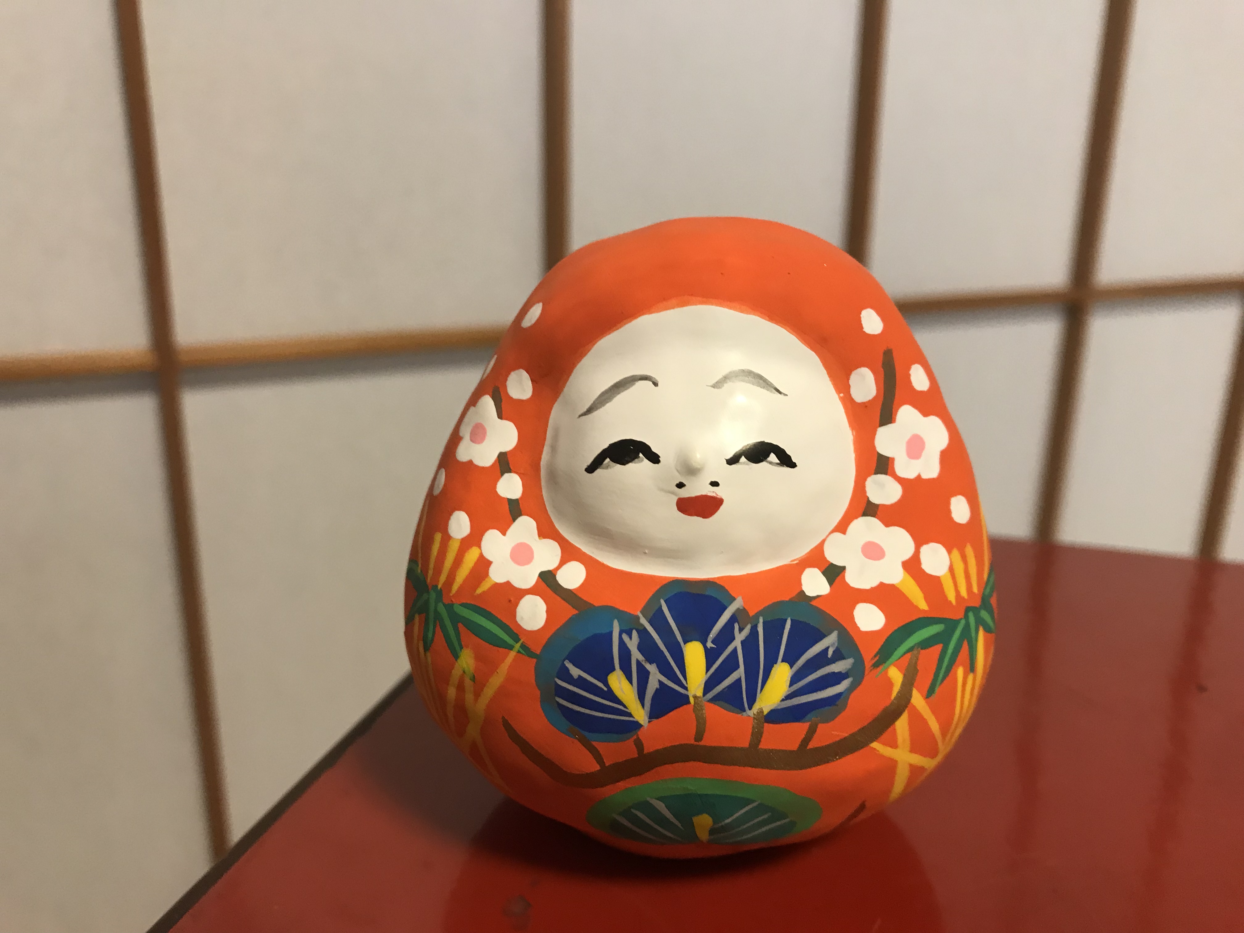 張り子で作られており、全体は赤く塗り上げられ胴には松竹梅の模様が描かれた典雅な人形です。