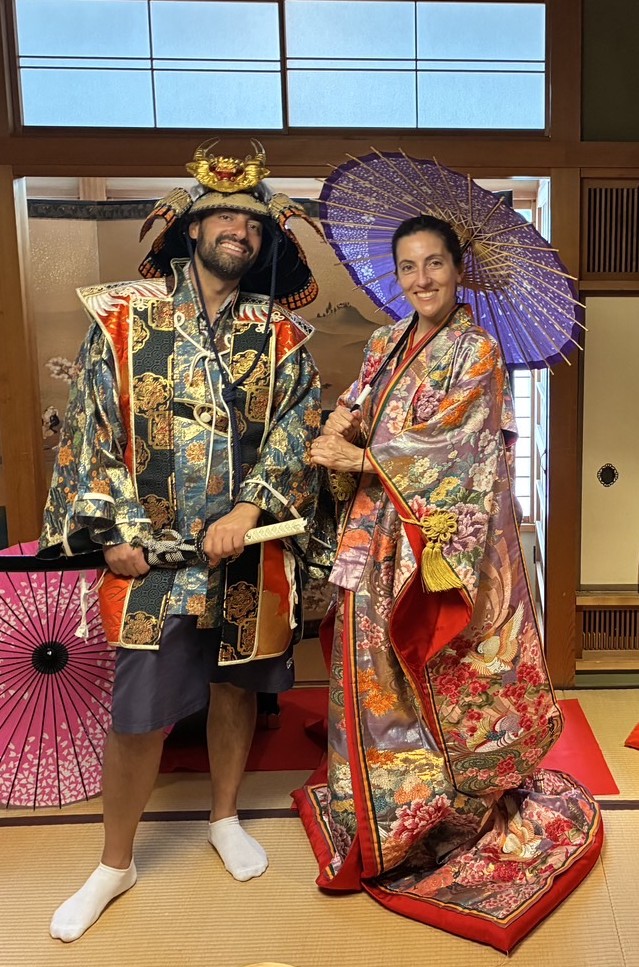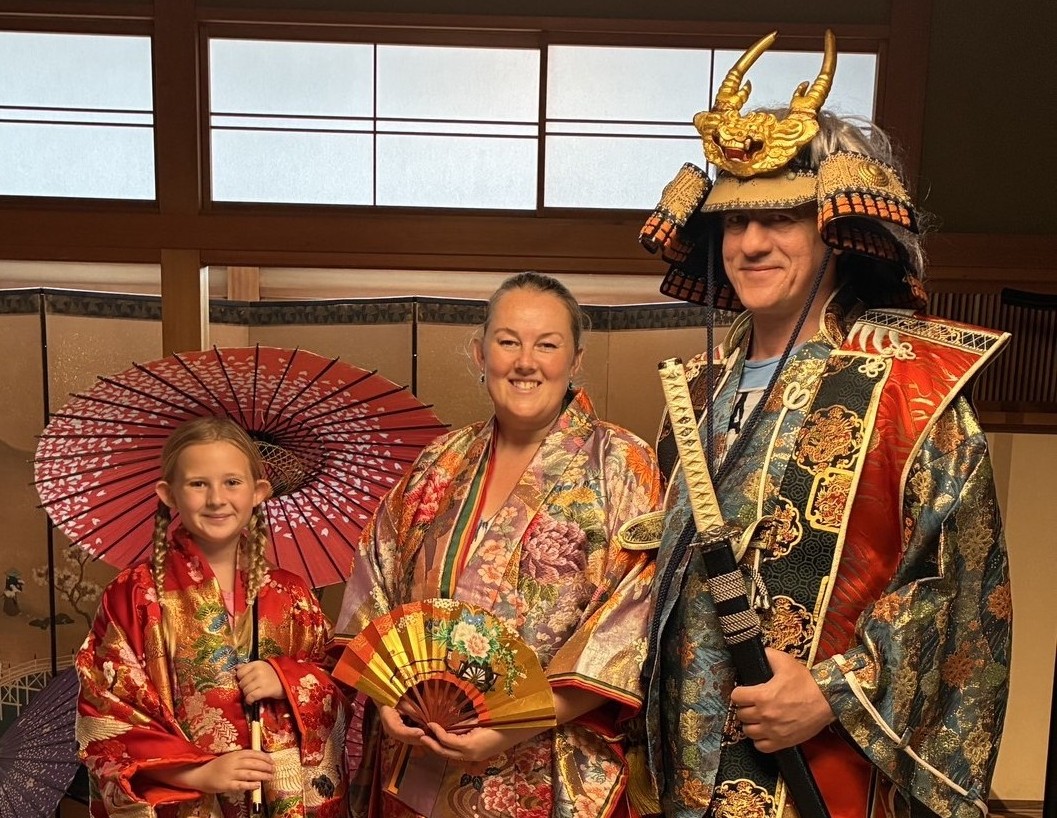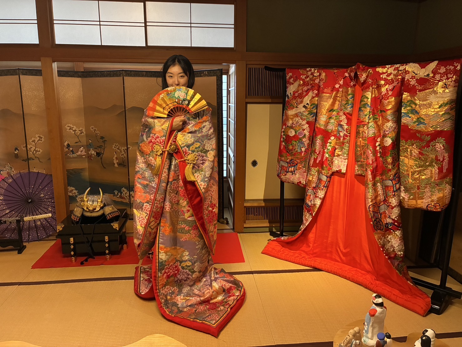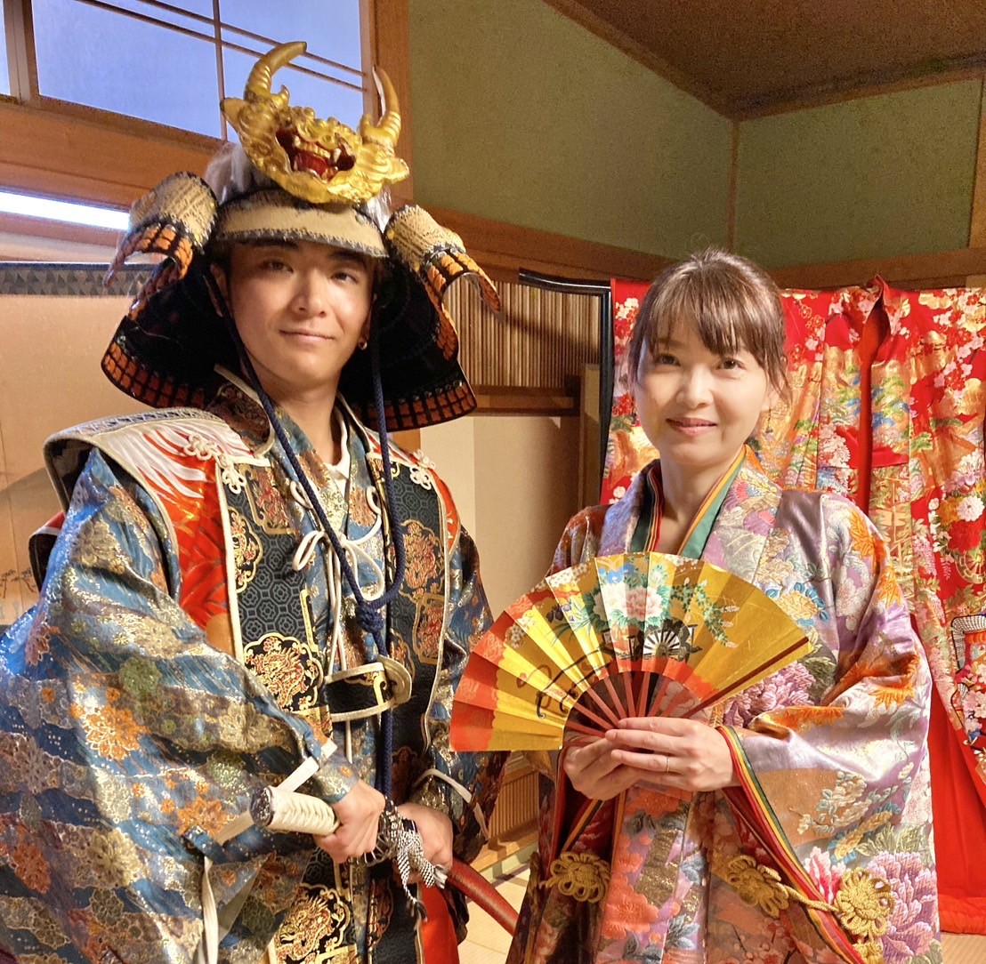 2階の土人形のお部屋で男性は兜陣羽織、女性は色打掛を羽織って記念写真を撮影頂けます。ご入館いただいたお客様は無料で体験可能です。