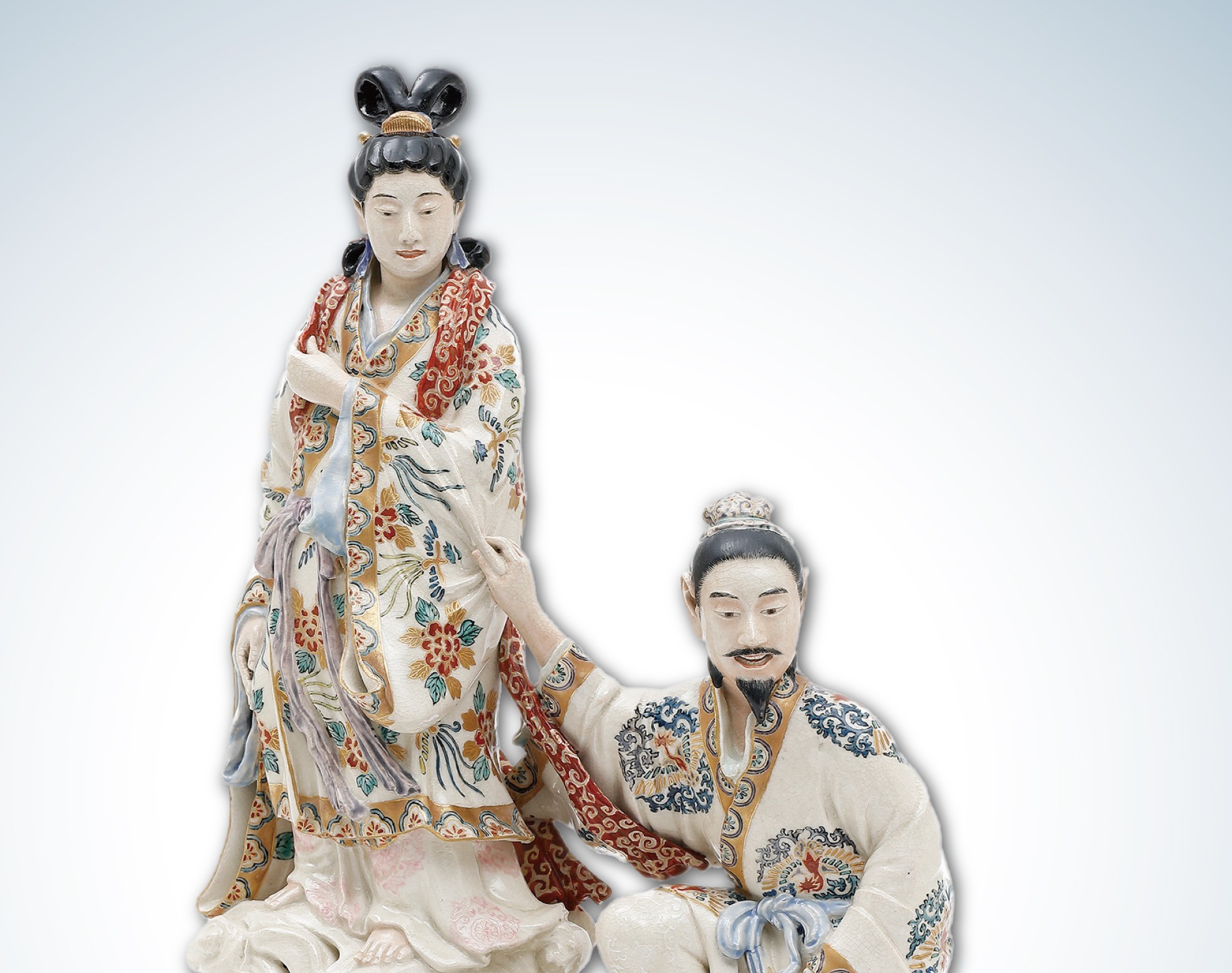 こちらの織姫彦星像は19世紀の薩摩焼を代表する名工・藪明山(やぶめいざん)によって作成されました。 世界的にも貴重とされる「捻り物 (置物細工の薩摩風の呼び方) 」の作例のひとつで、白磁部分は鹿児島の名窯・12代沈壽官窯によって成形され、そこに藪明山が繊細な上絵付けを施しています。
